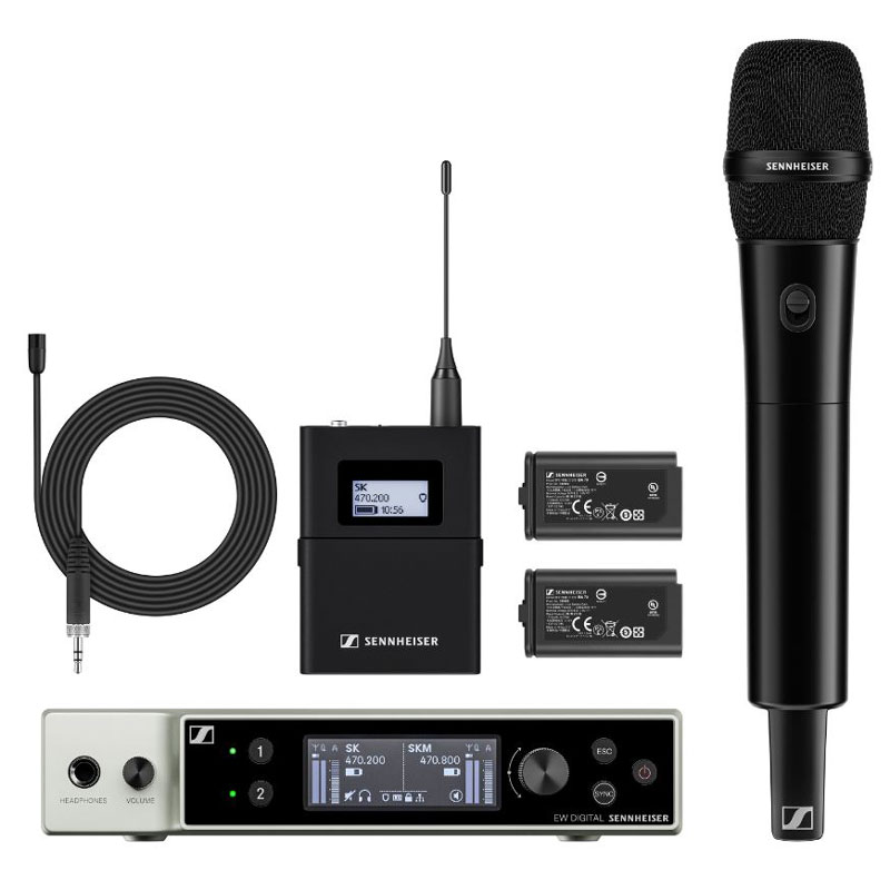 该套件包括2个EW-DX SKM-S(带开关的手持式发射机)、2个MMD 835音头(心形、动圈)、1个EW-DX EM 2机架式接收机(2个通道)和2个BA 70可充电电池。